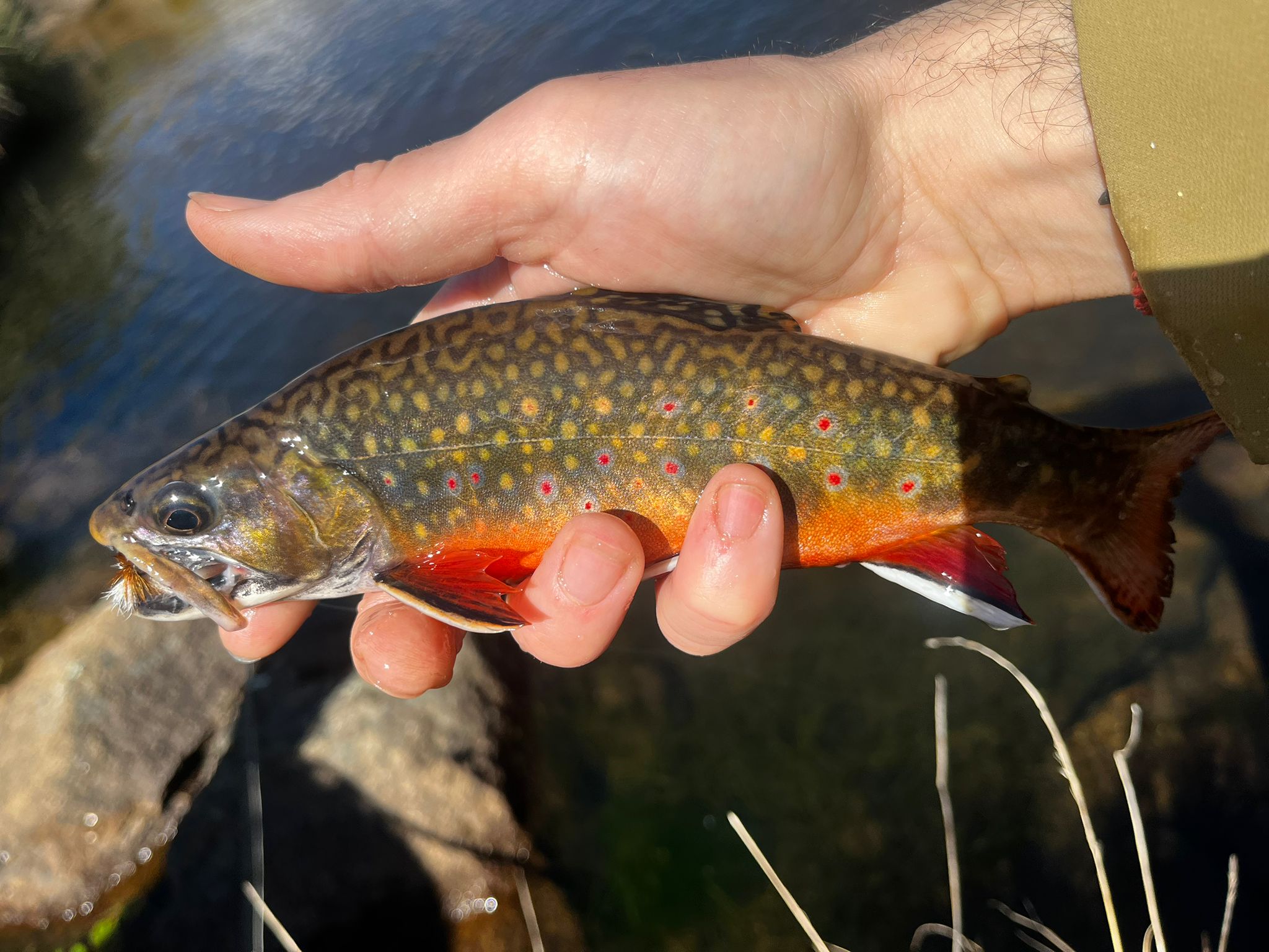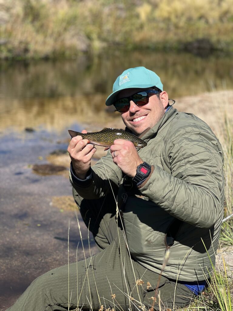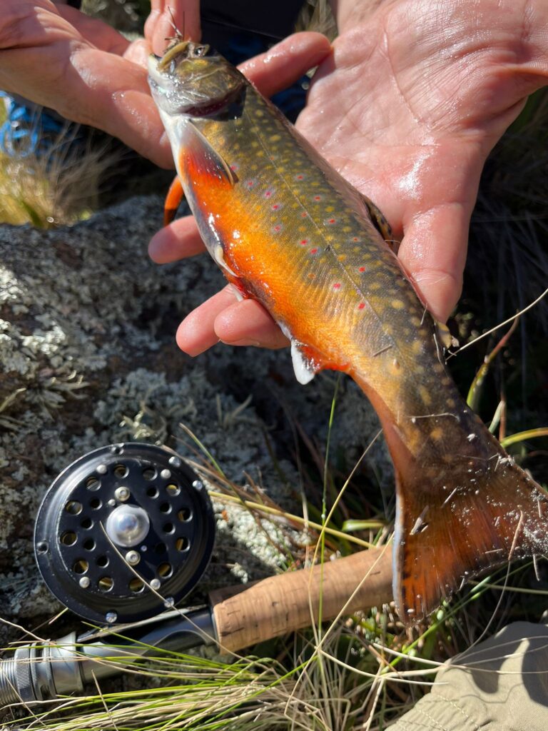 Las truchas eran brook trout—en realidad una especie de salmónido. Y como sabrán, los brookies con mosca seca suelen ser muy agresivos, brindando horas de diversión. Pero lo que hacía especial a esta pesca era el reto: agua muy lenta, baja y cristalina—además de cielo despejado. No sueles asociar pesca técnica con brook trout, pero aquí era una verdadera prueba.