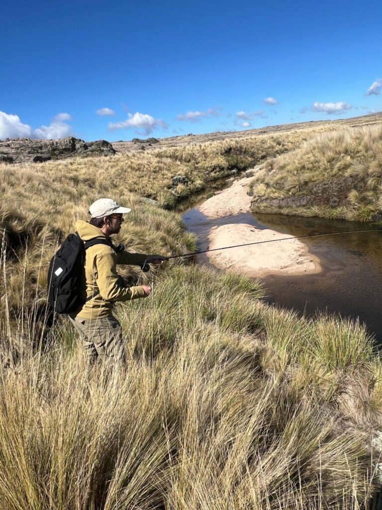 Pesca sigilosa y al acecho era la regla. Hugo nos hacía analizar cada poza con intención, estrategia: ¿Un lance alto evitando los arbustos del backcast? ¿O gatear tras un pastizal grueso y lanzar con técnica de “arco y flecha”? Cada situación requería una táctica distinta, y todas valían si ofrecían mejores chances. Hugo, como un buen teniente, subía al borde del cañón, analizaba todo y volvía con un plan.