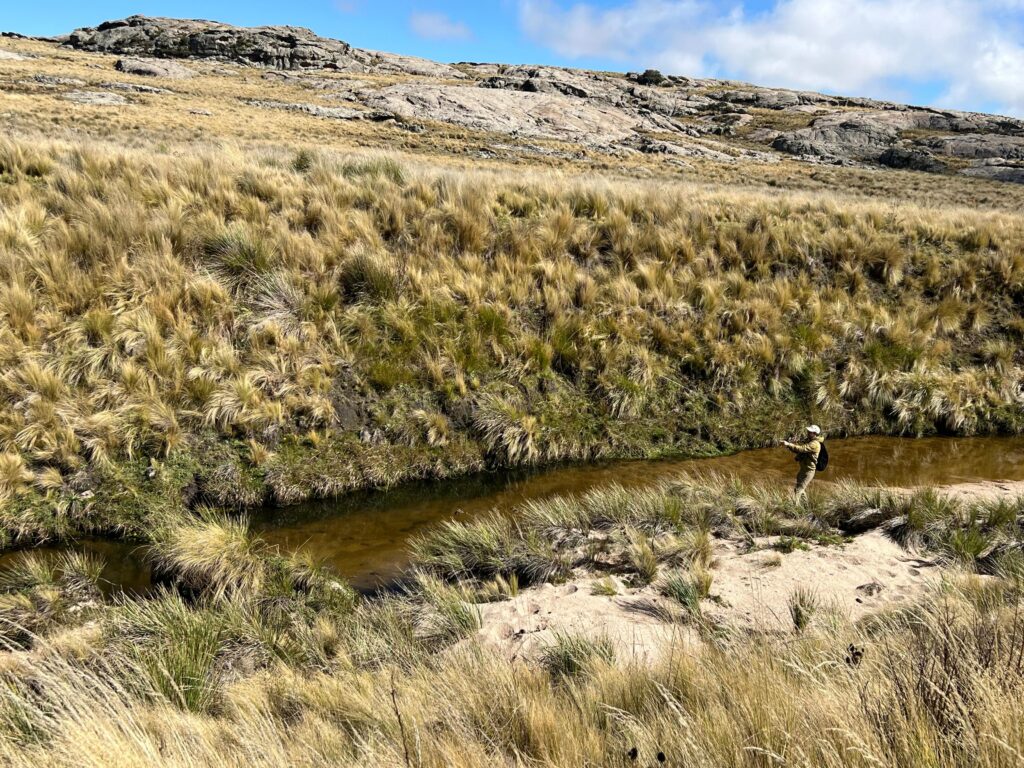 Visito las Sierras de Córdoba desde niño. Es un destino popular en verano, lleno de miradores, pueblos y festivales. Había oído rumores de que las poblaciones de trucha habían sido diezmadas en los años 50, así que no esperaba encontrar pesca épica en esas formaciones rocosas. El sitio que tenía en mente Hugo estaba a una hora de casa de mi familia, a unos 2.000 metros de altura, en las cabeceras de los ríos principales de la provincia. Aguas cristalinas brotan en charcos, luego se vuelven arroyos, que evolucionan en ríos—y en algún punto, se convierten en hogar de truchas cordobesas salvajes.