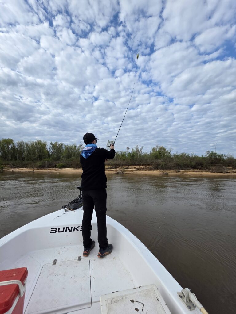 La idea era pescar dorados especialmente en la modalidad baitcasting. Justamente mientras desayunábamos cruzamos unas palabras con dos pescadores con mosca que habían llegado desde Salta para probar suerte con el flycast, justamente empujados por los datos que hablaban de una notable mejora en las condiciones del río, y en los piques que se pueden conseguir con esa técnica.
