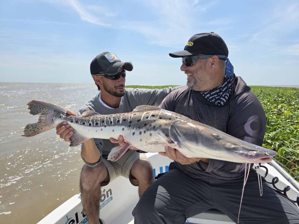 La situación fue increíble, porque no pasaron más de 100 metros que Ricardo pegó el grito: “¡Pique!”, y el reel que tenía, comenzó a chillar anunciando que había un pez importante en el extremo. Primera pasaba y primera captura… tenía razón el guía… los surubíes estaban en la zona, pero no tomaban la carnada que le ofrecíamos. Hermosa primera captura, y tras la devolución y los abrazos, emprendimos la segunda pasada.