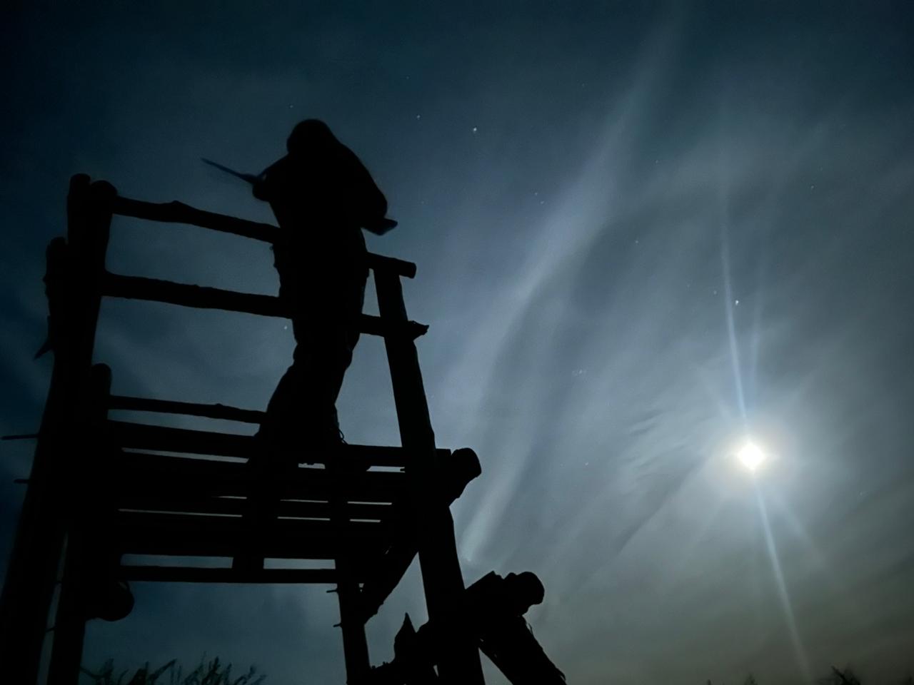Salí hasta una calle donde habíamos acordado encontrarnos con Marcos y nos quedamos apostados juntos. El campo cuenta con algunos mangrullos pensados como apostaderos en altura, ubicados estratégicamente en claros y aguadas. Ya para las 19:30 hs. comenzamos el regreso al vehículo y nos encontramos con Santi, quien estaba en otro apostadero intentando atraerlos con un silbato. Los axis contestaban desde todas direcciones, pero ninguna se atrevía a salir del monte aún. Tipo 20:30 hs pegamos la vuelta a la casa para ir a cenar.