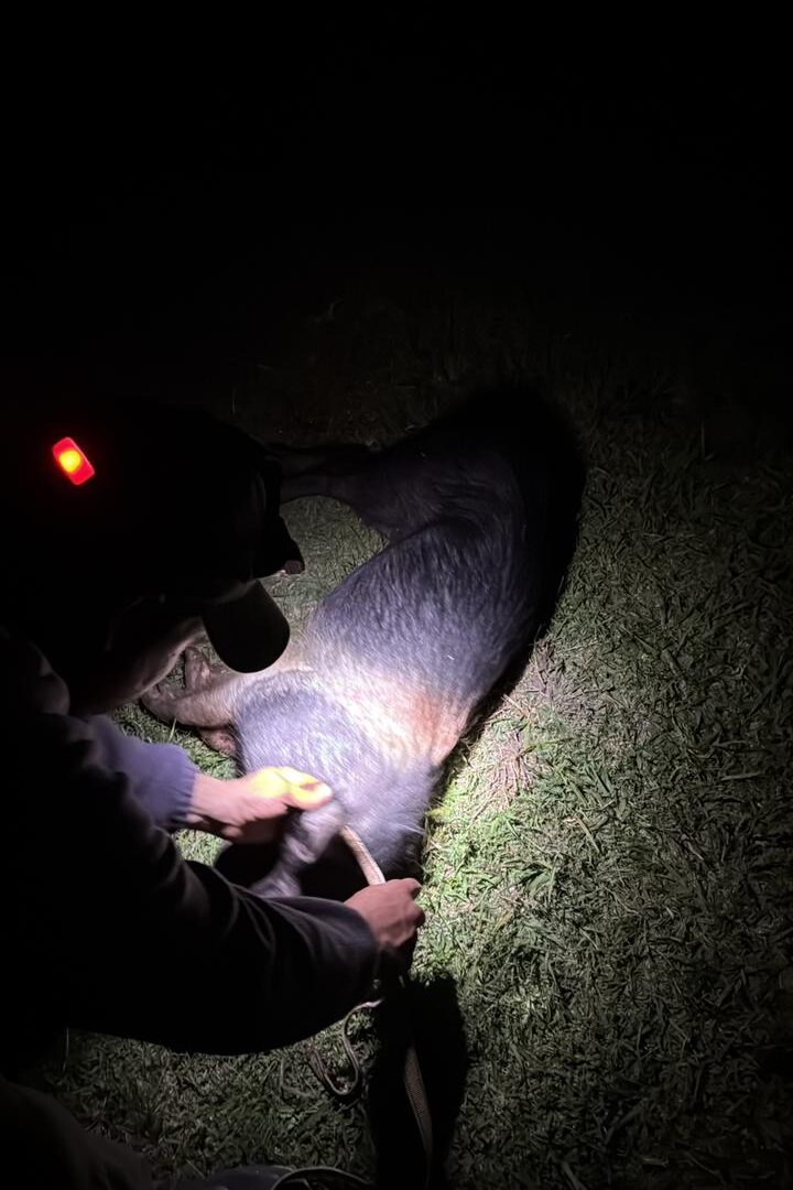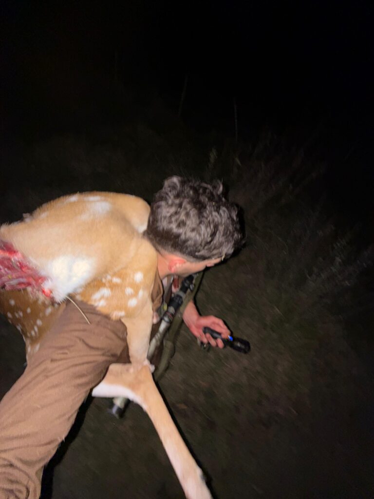 En la madrugada nuestra suerte cambió y los ciervos decidieron salir del monte a pastorear una chacra sucia de renuevo de aromos. Logramos cazar dos grandes ciervas, también pudimos ver un macho espectacular ya terminado con unas 5 hembras alrededor, pero estaba a unos 1000 metros y nos tocaba gatearlo. Auspicié de guía por un momento y fuimos, junto a Marcos, en cuatro patas, lo más sigiloso posible.